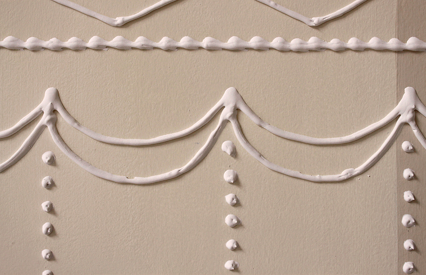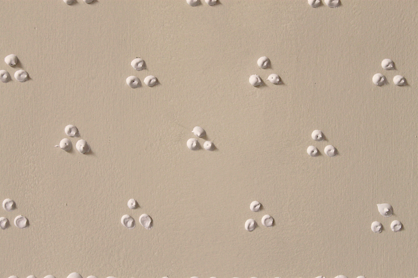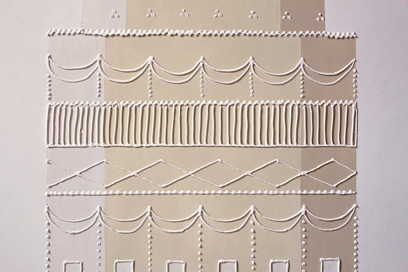 The work refers in texture and color, to a traditional wedding cake , but created with plaster filling applied on cardboard, by means of a pastry bag, accentuating its playful and ceremonial character.